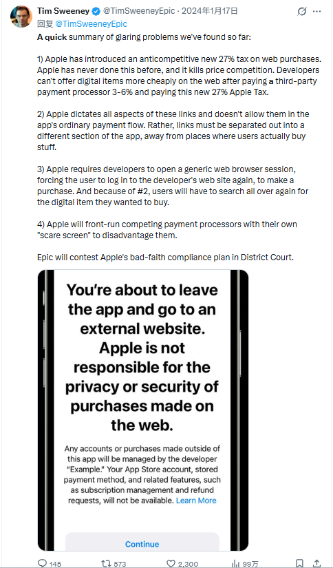 苹果是怎么执行这一条的呢?根据Tim Sweeney的叙述,主要是四个方面,第一点也是最重要的一点是用户在外部链接支付后苹果要征收27%的新税,加上3%~6%的第三方支付服务费,并不比原有的「苹果税」低。
