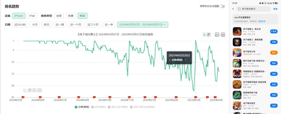 作为腾讯旗下的爆款手游,在离开了部分安卓渠道后,并没有多少影响到其成绩,在当年多次登上iOS畅销总部第一。值得一提,时至今日,《地下城与勇士:起源》在部分安卓渠道仍未上架。